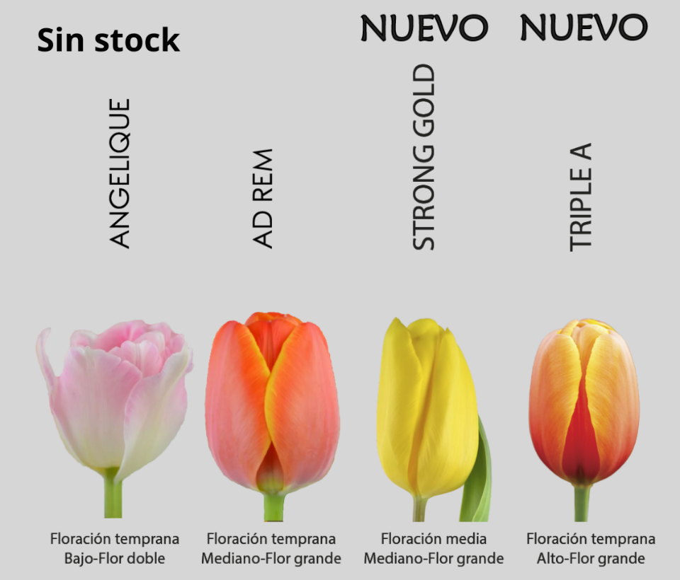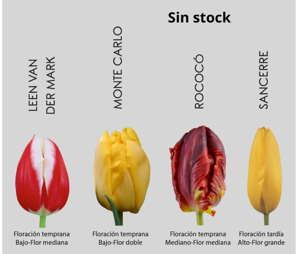 Aquí podés ver todas la variedades que tenemos disponibles (sujeto a stock en el momento de la compra) 🌷 Importante: Recordá indicar los colores y variedades elegidas en el campo “Observaciones” antes de finalizar la compra.